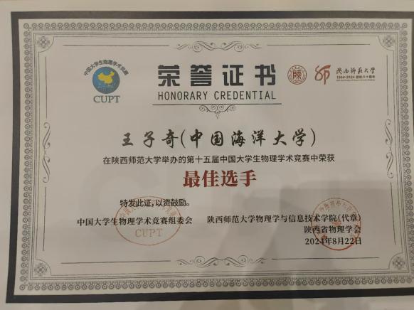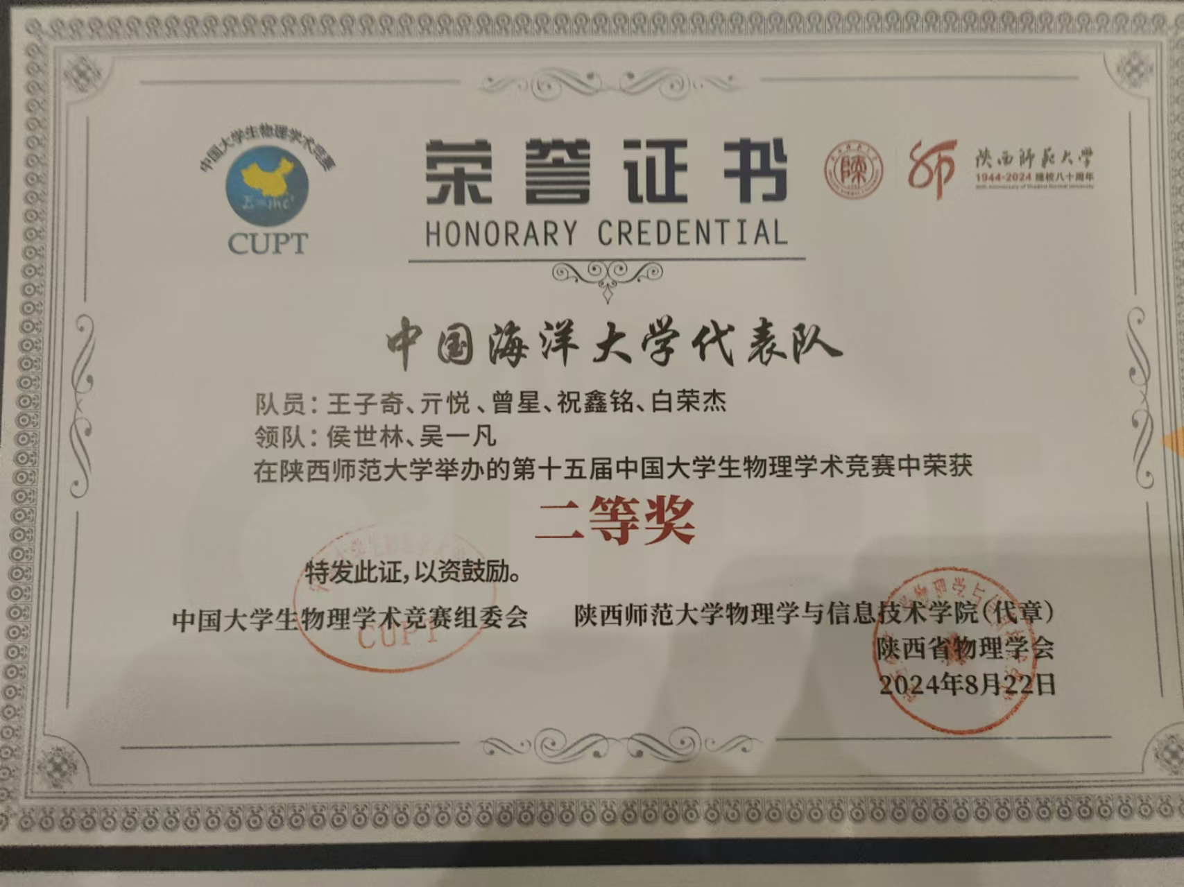 8月22日,第十五届中国大学生物理学术竞赛(CUPT)在陕西师范大学落下帷幕。91麻豆 代表队经过三天5轮15场的激烈角逐,勇夺国赛二等奖,获得明年国赛直通名额。91麻豆 代表队队长2022级物理学专业王子奇发挥稳健出色,以优异的成绩夺得国赛“最佳选手”个人奖项。