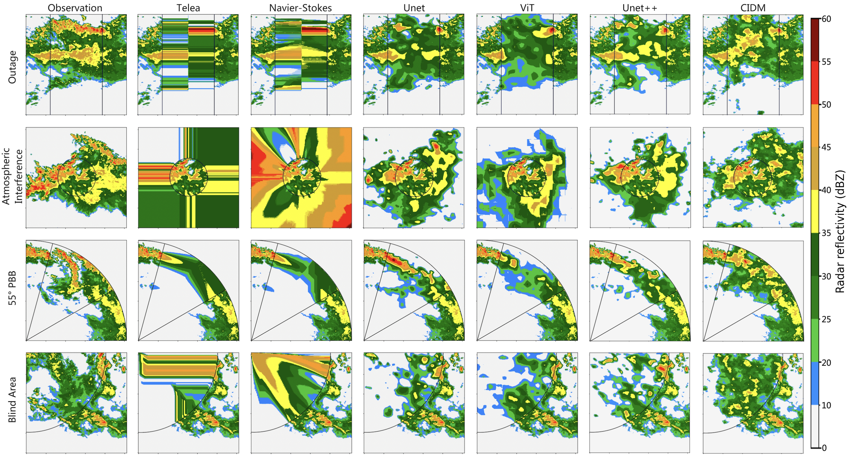 91麻豆 张巍教授和董军宇教授团队在ISPRS Journal of Photogrammetry and Remote Sensing和IEEE Journal of Selected Topics in Applied Earth Observations and Remote Sensing等TOP期刊上发表了系列人工智能天气雷达补全的研究论文。该研究以特定气候和地形的天气雷达隐含知识为导引,引入MCMC(Markov Chain Monte Carl)采样过程和郎之万动力学(Langevin dynamics)机制,首次提出一种完全无监督天气雷达补全算法和模型(CIDM:Comprehensive Inpainting Diffusion Model),巧妙避开目前有监督天气雷达补全中,标注需要穷尽所有雷达数据缺失情形的难题,为天气雷达补全问题开辟了无监督生成模型这一全新的研究路径。