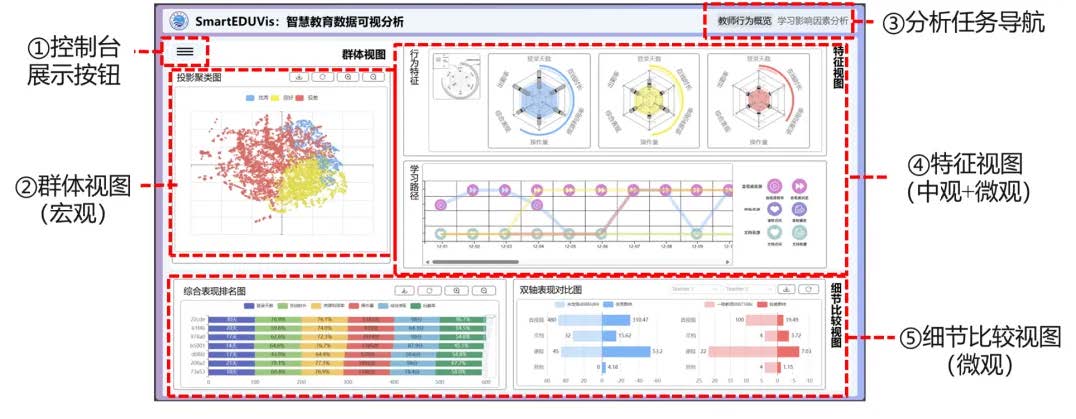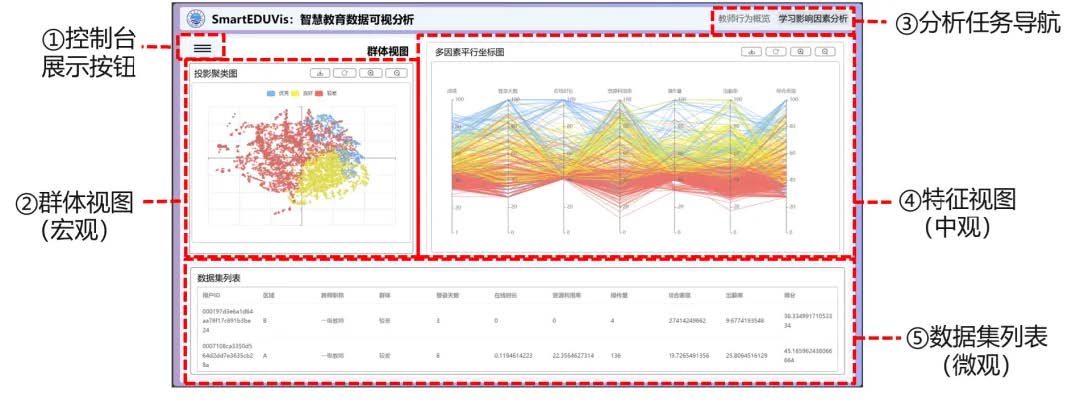 SmartEDUVis:智慧教育数据可视分析以国家智慧教育平台教师用户数据为素材,对教育数据进行数据挖掘与可视化呈现,实现教师行为特征分析与学习路径,为教育决策提供精准参考依据,助力教育公平与高质量教育发展。通过融合多特征聚类算法,区分用户群体;通过设计学习行为概览与学习路径的新颖可视化图表,展示群体和个人在六大维度上的学习行为特征,以及用户随时间变化的学习成长的轨迹。