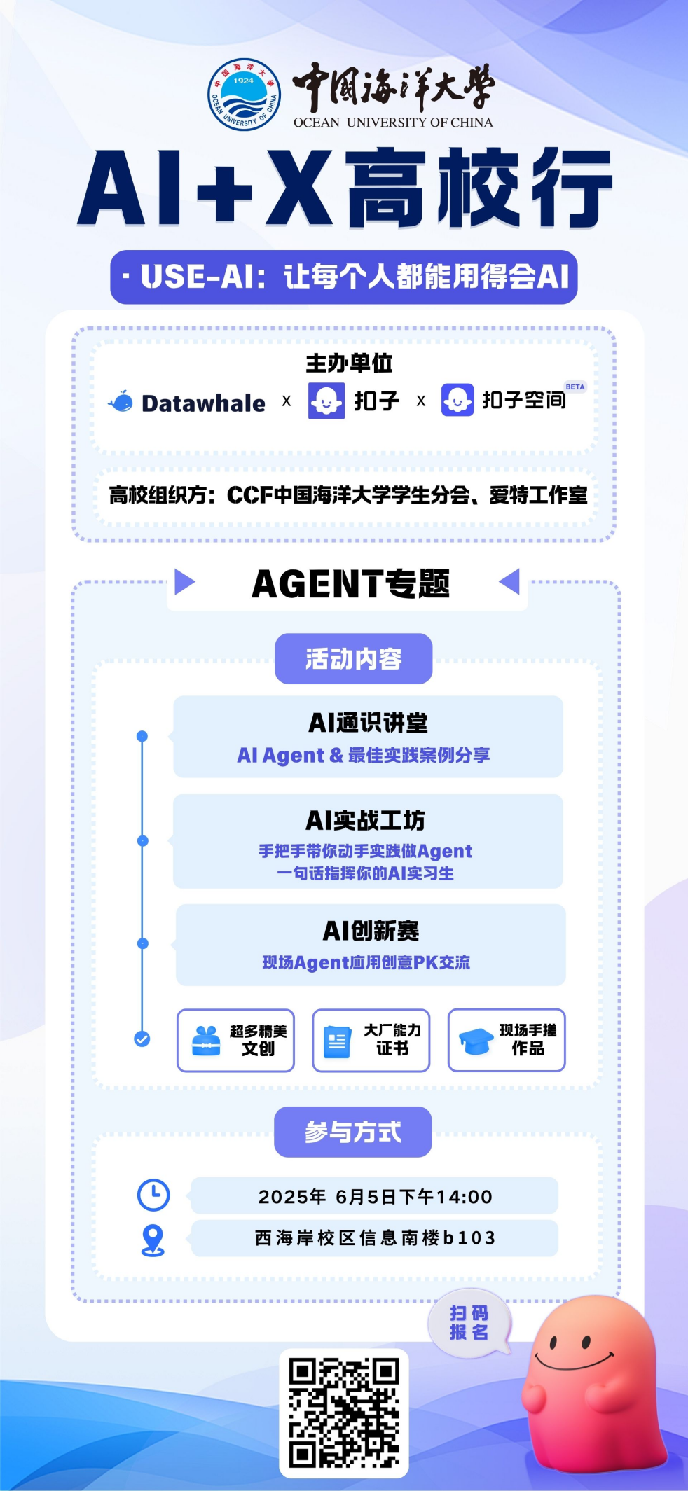 在人工智能飞速发展的今天,AI Agent正在成为推动行业变革的关键力量。为了助力同学们提升AI技术能力,紧跟前沿技术趋势,CCF91麻豆 学生分会、爱特工作室携手Datawhale开源学习社区,将于2025年6月5日下午14:00在西海岸校区信息南楼b103启动“AI+X高校行Agent专题”活动。一场知识与实践的盛宴,一次创新思维的碰撞,一次探索AI无限可能的奇妙之旅,等你来赴约!