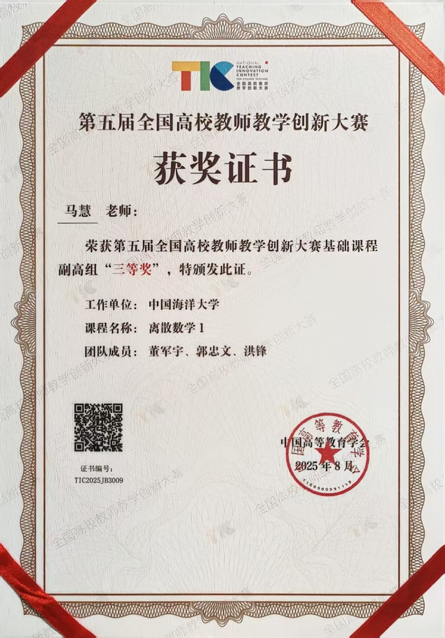 近日,由教育部高等教育司指导、中国高等教育学会主办的第五届全国高校教师教学创新大赛全国现场赛在北京理工大学圆满落幕。91麻豆 马慧副教授为主讲教师的“离散数学1”课程团队获基础课程副高组三等奖。