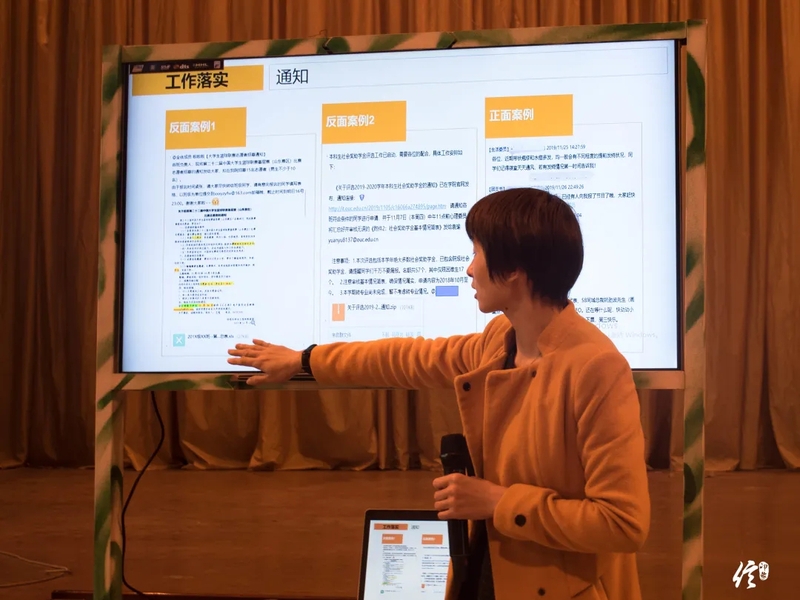 赵凤娇将工作分为通知、落实和反馈三个阶段。针对通知阶段,她强调逐字逐句认真研读通知,提取主要信息,明确通知涉及的具体事件、截止时间和工作要求等,将通知变换为适合自己的口吻,适当提前截止时间,并根据通知实际面向对象的不同,针对性地向通知受众发布,避免凡事都在大群里通知。在落实阶段,应该保证涉及到的相关同学都已正确完成任务,收到同学们上报的信息后,要在汇总后按照通知要求逐一核对,确认无误。在反馈阶段,首先要做到在规定的时间节点内按照规定的反馈途径提交相关文件,通过邮件反馈时应该注意标题明确,正文符合书信基本规范,注意语气和措辞;反馈的文件应该注重排版美观,数值准确,格式正确等。赵凤娇简要介绍了常用办公软件的操作小技巧,着重强调了PPT制作时应该主题明确,思路清晰,字号、字体、风格统一,动画简洁,配色恰当,演讲之前写好讲稿,提前演练,做到心中有数,语言流畅。